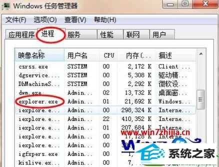 原因二:桌面windows资源管理器停止工作1、按ctrl+shift+EsC调出windows任务管理器窗口,在“进程”中找到“explorer”的进程;