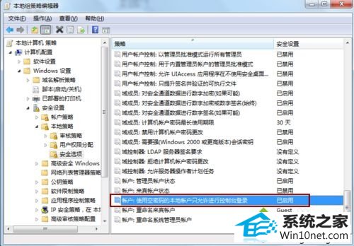 4、在右侧策略处找到“账户:使用空白密码的本地账户只允许进行控制台登录”,此策略默认是已启用;