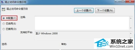 4、将阻止访问命令提示符状态更改为未配置或者已禁用,并确定生效,如图所示: