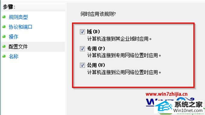 6、然后在配置文件窗口中,勾选“域”、“专用”、“共用”三个配置文件,点击“下一步”;