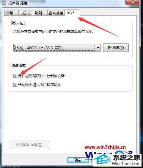 4、弹出属性窗口,在属性窗口中选择高级:在高级页面可以看到中部位置,有两行字,“运行应用程序独占控制该设备”,“给予独占模式应用程序优先”,把前面的钩去掉;